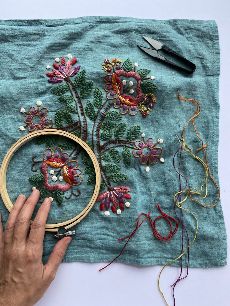 Bright and cheerful colours with three different flowers and plenty of leafy foliage for beautiful texture. I stitched mine onto a blue piece of linen.