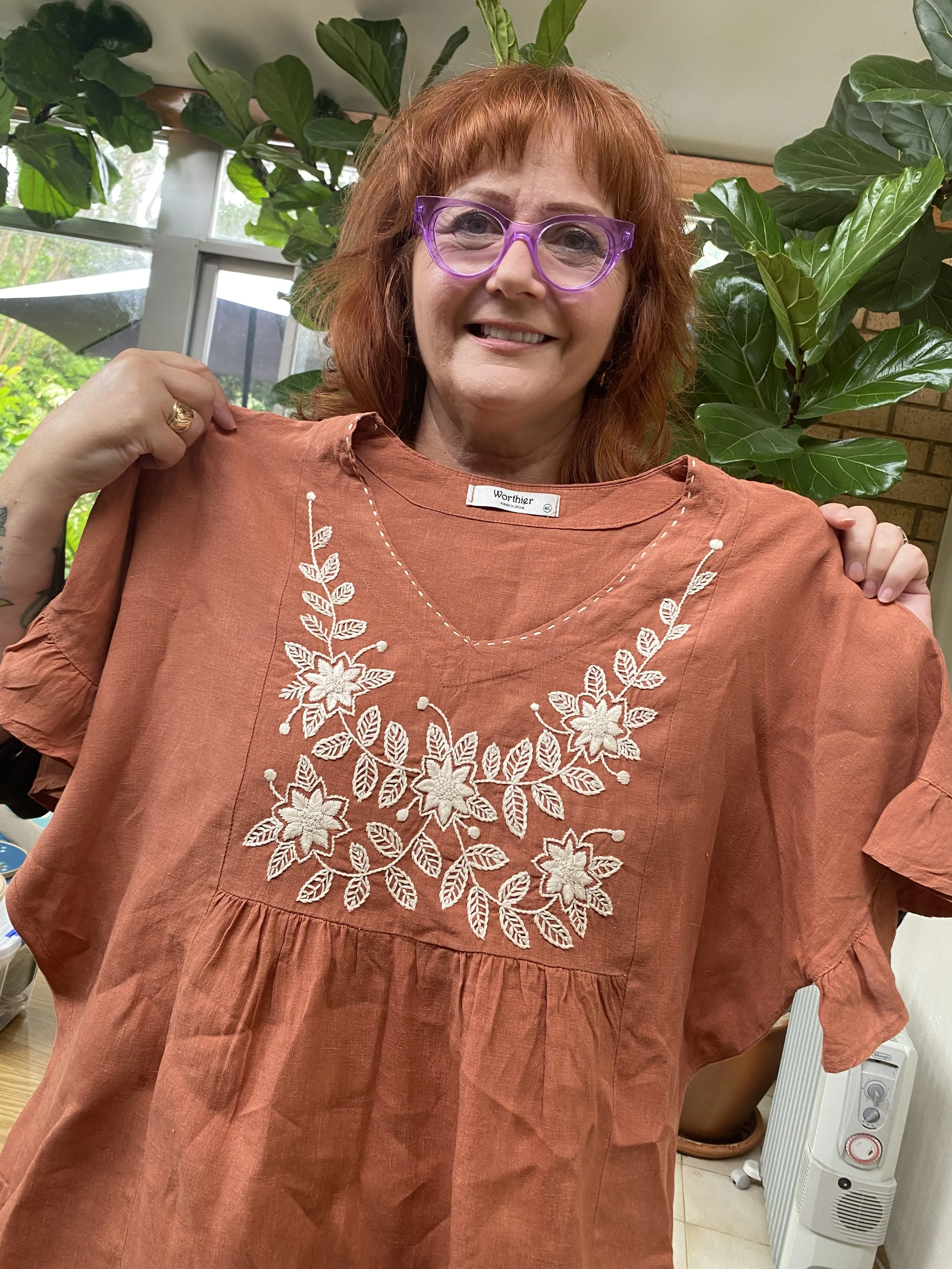 Terracotta linen dress stitched by Eddie (pattern drawn directly onto dress by Kasia)